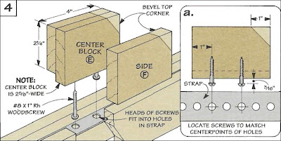 ADJUSTABLE HEAD. Like the fixed head, it’s built up by gluing a center block (E) between two side pieces (F), see Fig.4. The center block is cut wider (taller) than the side pieces so it fits down between the rails.