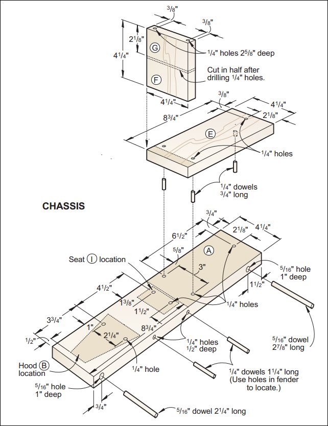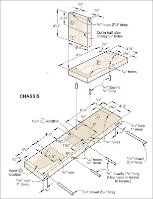 4. Clamp the fenders to the chassis 6 5/8" from the back edge where shown on the Exploded View. Using holes in the fenders as guides, drill 1/4" holes 1/2" deep into the edges of the chassis. Glue 1/4" dowels 11/4" long into the chassis for supporting the fenders.