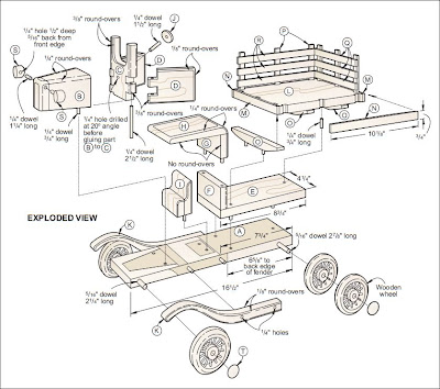 7. Now, cut the box stakes (P) and slats (Q, R) to size. Sand the stakes so they fit easily into the notches in the truck bed (L). Glue the four assemblies together, being careful to align the stakes with the notches in the truck bed.
