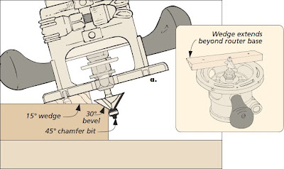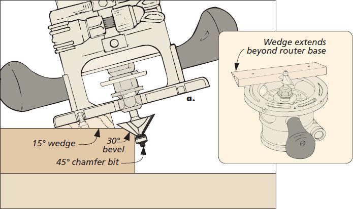 The solution was to create a 15° wedge for the base of my router, which put the cut I wanted right at 45°. To ensure a stable base, the wedge has to be wide enough to reach the outside edges of the router (see detail).