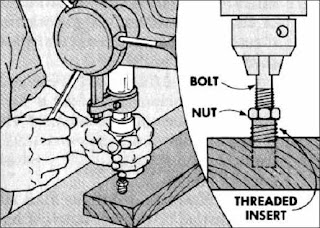 Start by drilling an undersized pilot hole for the insert. Find a spare bolt that fits the insert, cut off the head, and mount it in the chuck. Next thread a nut and the insert on to the bolt, see drawing. Tighten the nut to make sure the insert is secured to the bolt.
