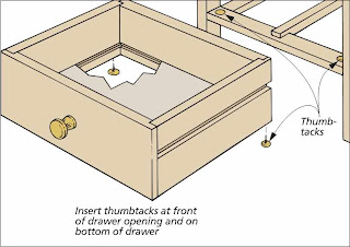 After assembling each drawer, I drill a small hole on each joint line, as shown in Fig. 1. Then I insert and glue a short dowel into the hole to form a "locking" pin.