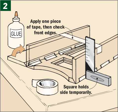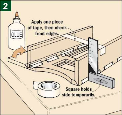After flipping the pieces over face down, put glue in the valley of the miters (Fig.1). Then flip up one side and use a small square to hold it in place (Fig.2). Now stand the second side up and tape across the two sides (see photo at top). To adjust the fit of the joint, loosen or tighten the tape.